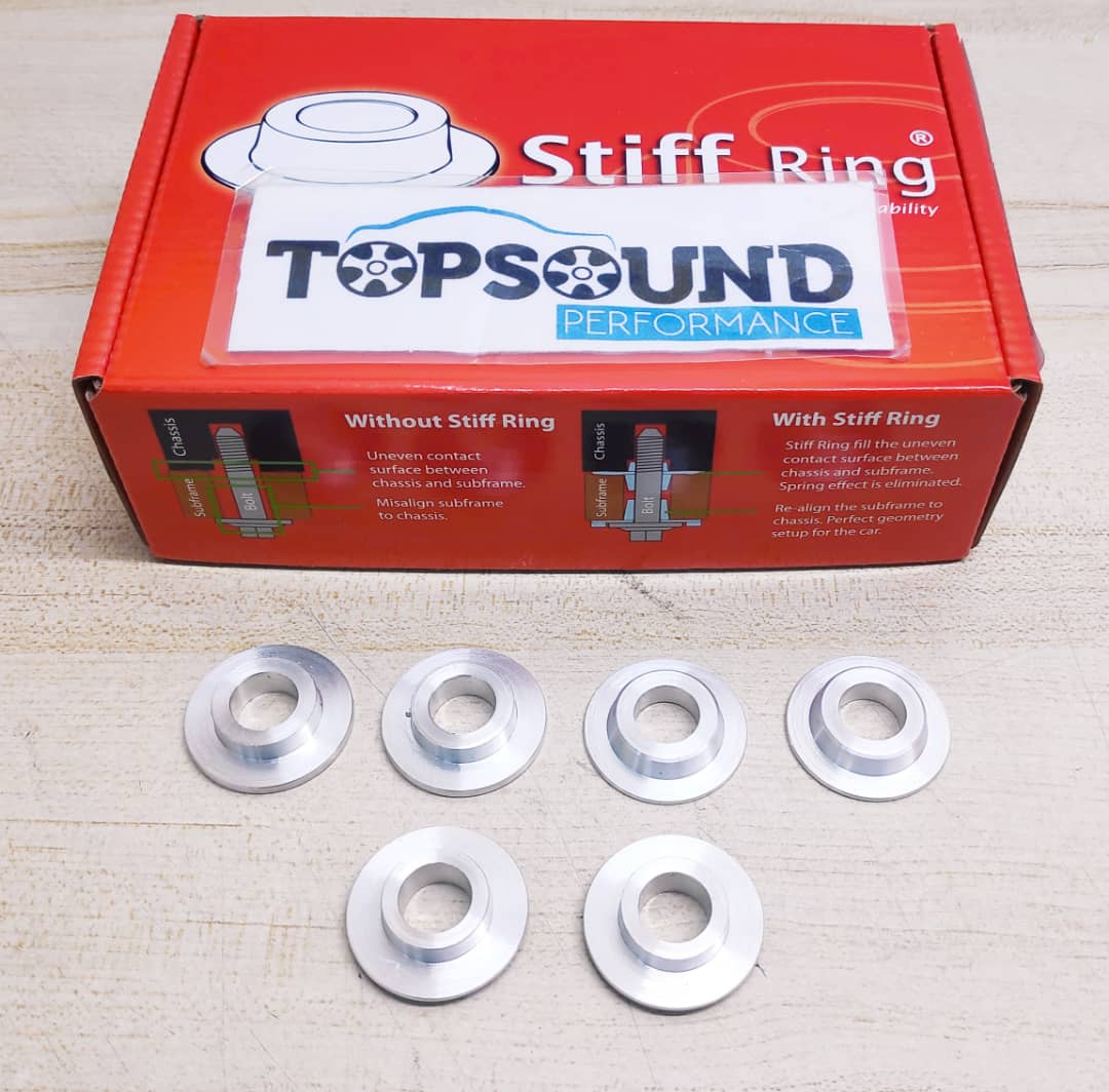 With the Stiff Ring in proper place, the gap is filled up to stop the movement of the sub frame and the car body forever and provide ideal alignment between both, as a result of a perfect geometry setup. Uneven surface is filled up by Stiff Ring, thus, spring effect is remove and resulting a comfortable cabin even further improved the car stability.