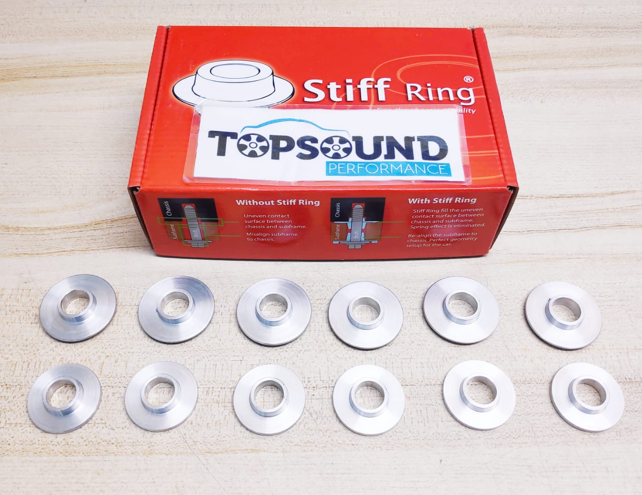 With the Stiff Ring in proper place, the gap is filled up to stop the movement of the sub frame and the car body forever and provide ideal alignment between both, as a result of a perfect geometry setup. Uneven surface is filled up by Stiff Ring, thus, spring effect is remove and resulting a comfortable cabin even further improved the car stability.