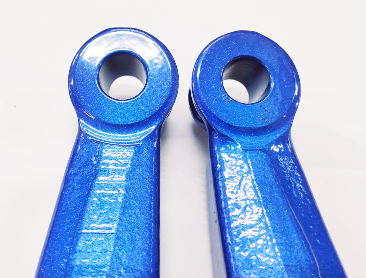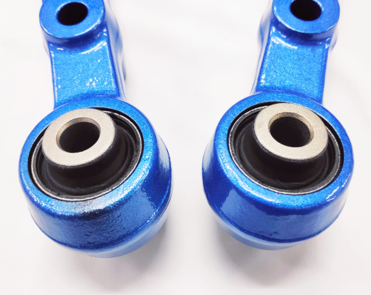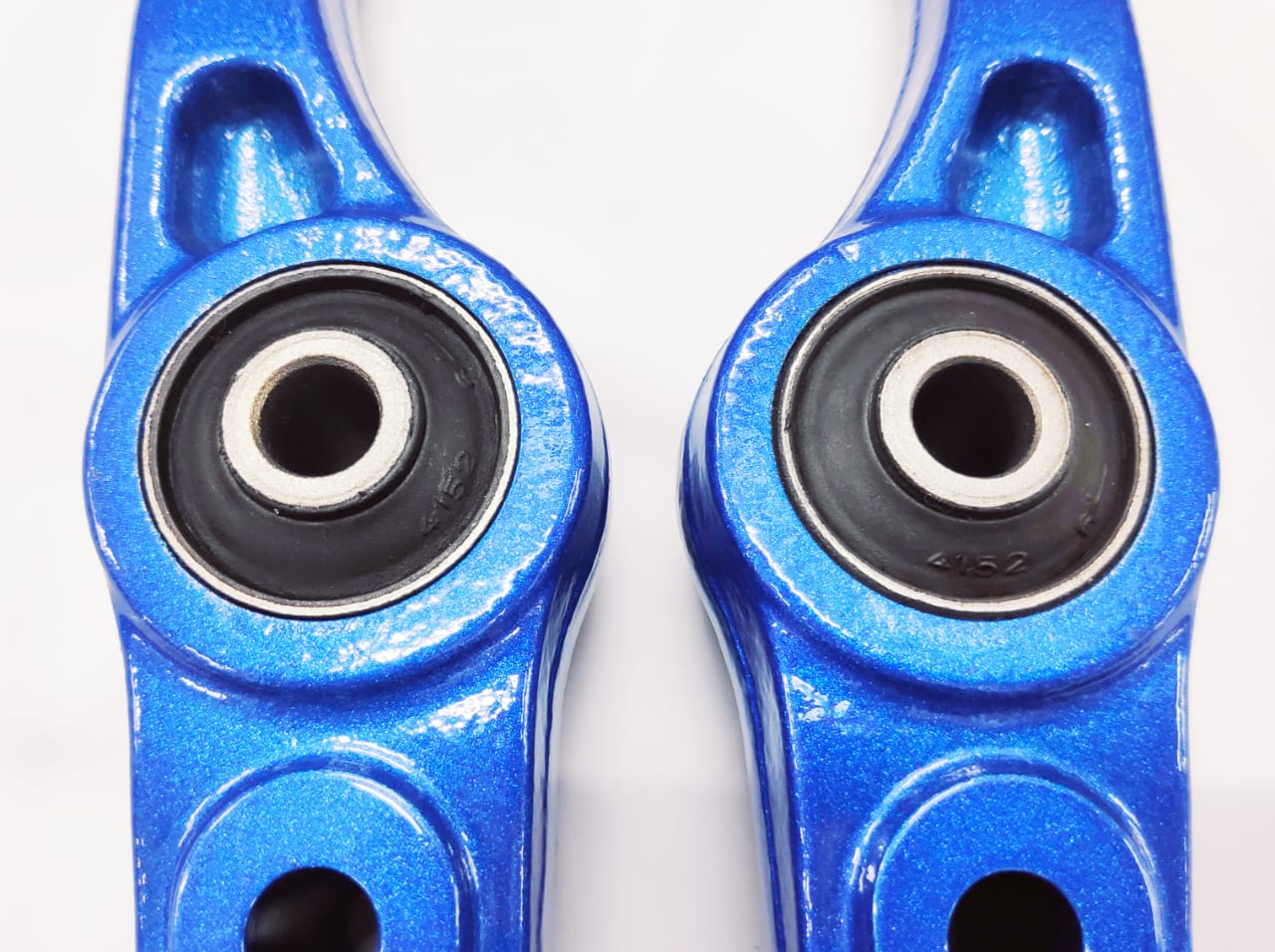 Control arm made with hardened steel and compound with hard rubber bushing or pillow ball bushing. A good control arm can regulate the movement of wheels quickly each time you turn or corner.