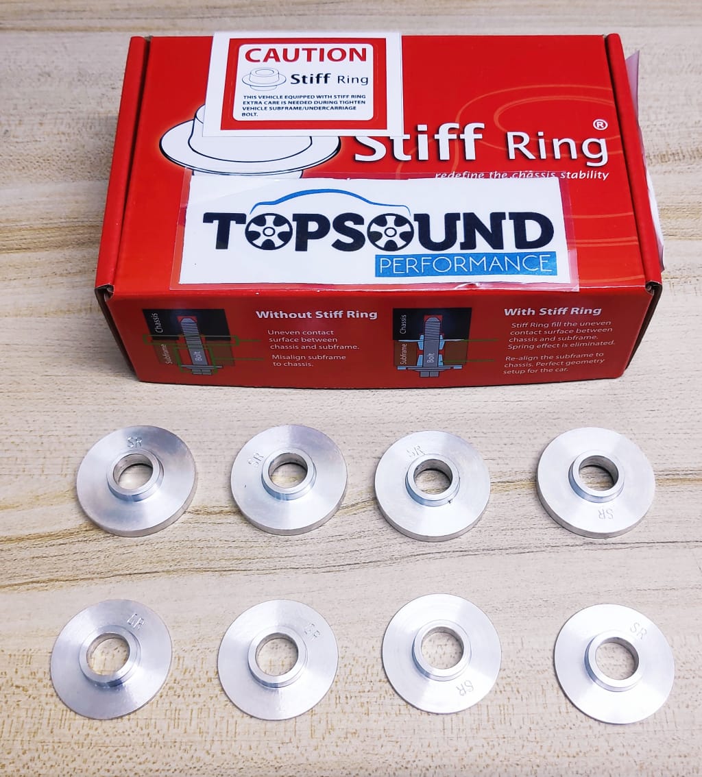 With the Stiff Ring in proper place, the gap is filled up to stop the movement of the sub frame and the car body forever and provide ideal alignment between both, as a result of a perfect geometry setup. Uneven surface is filled up by Stiff Ring, thus, spring effect is remove and resulting a comfortable cabin even further improved the car stability.