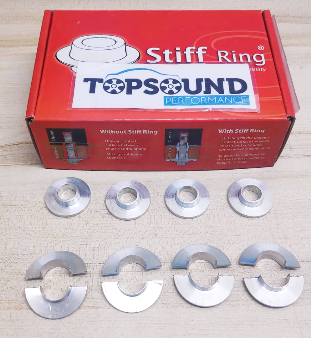 With the Stiff Ring in proper place, the gap is filled up to stop the movement of the sub frame and the car body forever and provide ideal alignment between both, as a result of a perfect geometry setup. Uneven surface is filled up by Stiff Ring, thus, spring effect is remove and resulting a comfortable cabin even further improved the car stability.