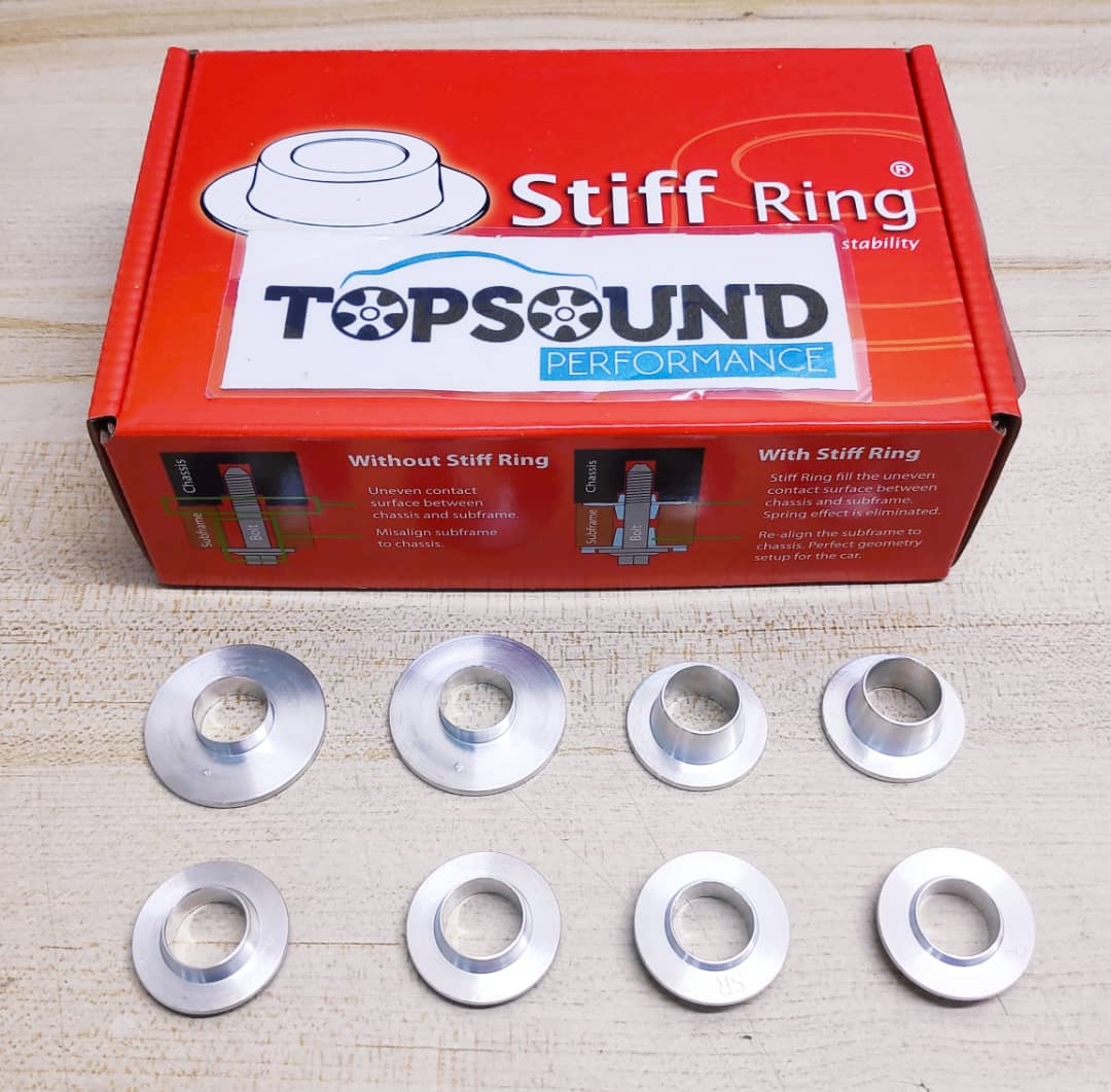 With the Stiff Ring in proper place, the gap is filled up to stop the movement of the sub frame and the car body forever and provide ideal alignment between both, as a result of a perfect geometry setup. Uneven surface is filled up by Stiff Ring, thus, spring effect is remove and resulting a comfortable cabin even further improved the car stability.