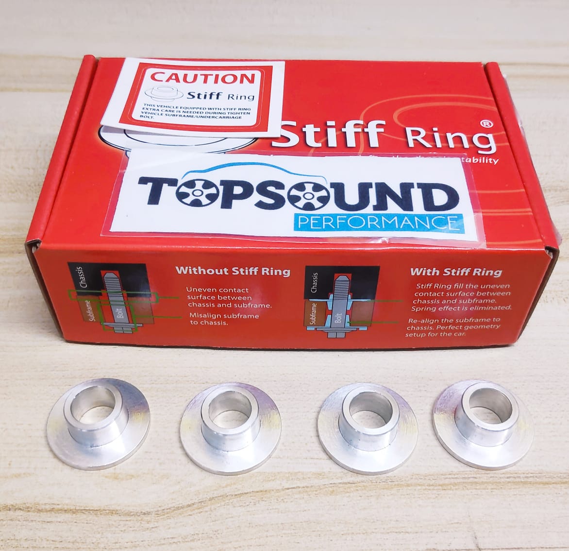 With the Stiff Ring in proper place, the gap is filled up to stop the movement of the sub frame and the car body forever and provide ideal alignment between both, as a result of a perfect geometry setup. Uneven surface is filled up by Stiff Ring, thus, spring effect is remove and resulting a comfortable cabin even further improved the car stability.