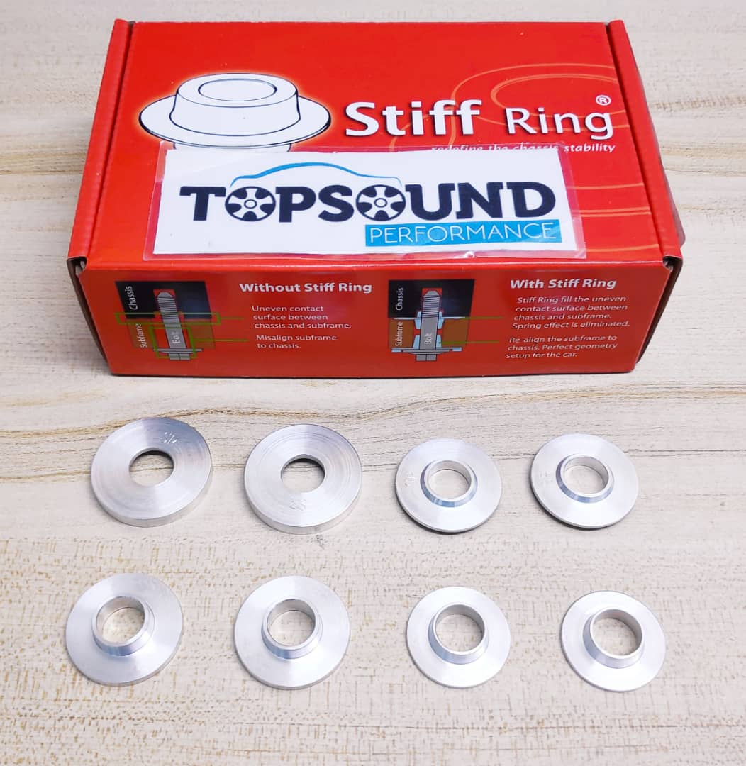With the Stiff Ring in proper place, the gap is filled up to stop the movement of the sub frame and the car body forever and provide ideal alignment between both, as a result of a perfect geometry setup. Uneven surface is filled up by Stiff Ring, thus, spring effect is remove and resulting a comfortable cabin even further improved the car stability.