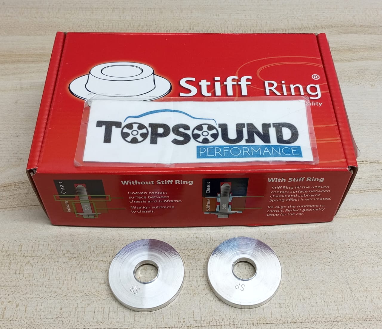 With the Stiff Ring in proper place, the gap is filled up to stop the movement of the sub frame and the car body forever and provide ideal alignment between both, as a result of a perfect geometry setup. Uneven surface is filled up by Stiff Ring, thus, spring effect is remove and resulting a comfortable cabin even further improved the car stability.